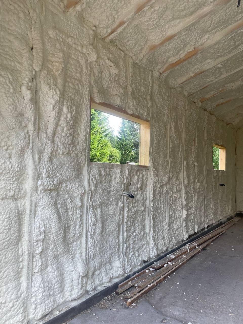 Мы выполнили полное утепление стен, пола и перекрытия с применением открытоячеистого ППУ плотностью 15 кг/м³ и толщиной 150 мм.